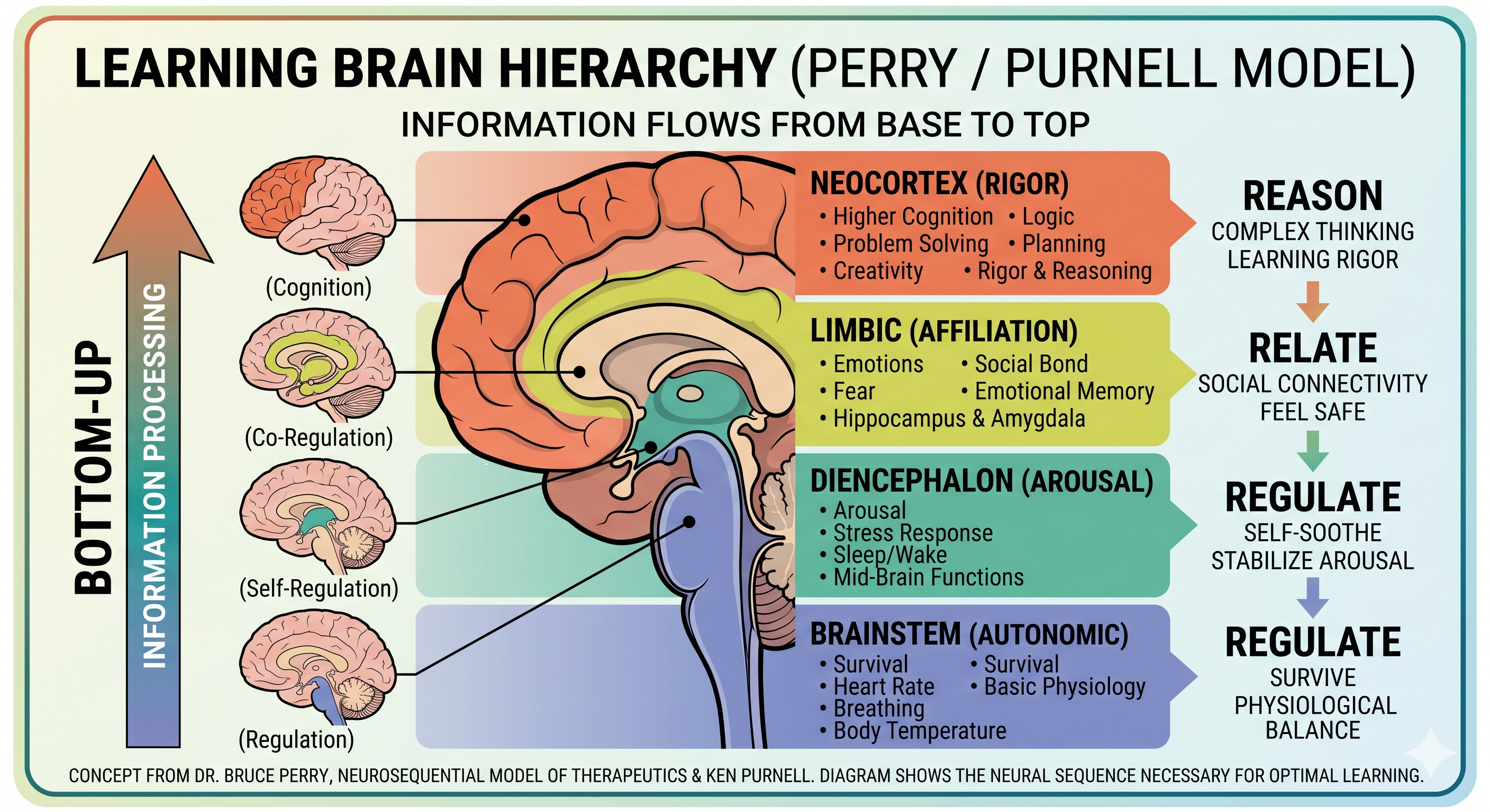Bruce Perry's Neurosequential Model of Education describes this hierarchy clearly: the brainstem regulates basic arousal and survival responses; the diencephalon coordinates sensory input and motor function; the limbic system processes emotion, memory, and threat; and only above all of that - only when the lower regions are sufficiently settled - can the cortex properly engage with abstract reasoning (Neurosequential Network, n.d.).